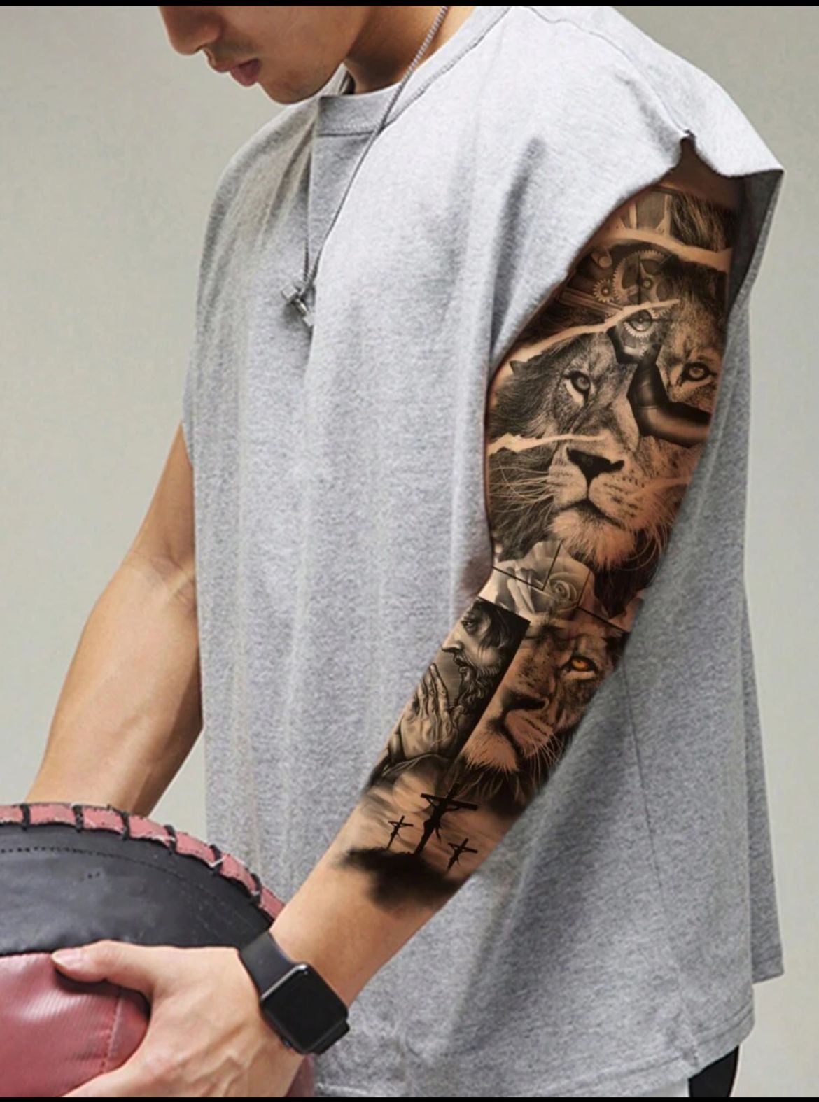 1 Sheets Extra Large Full Arm Size Body Art Temporary Tattoo Stickers For Men And Women, Black Realistic Lion Pattern, Waterproof Fake Sleeves Tattoos, Lasts 2-5 Days, Covering Scars, Can Be Used On Arms Wrist Shoulders Legs Waist Neck Hand Chest Thighs Finger, Best Friend Couple Party Tattoo