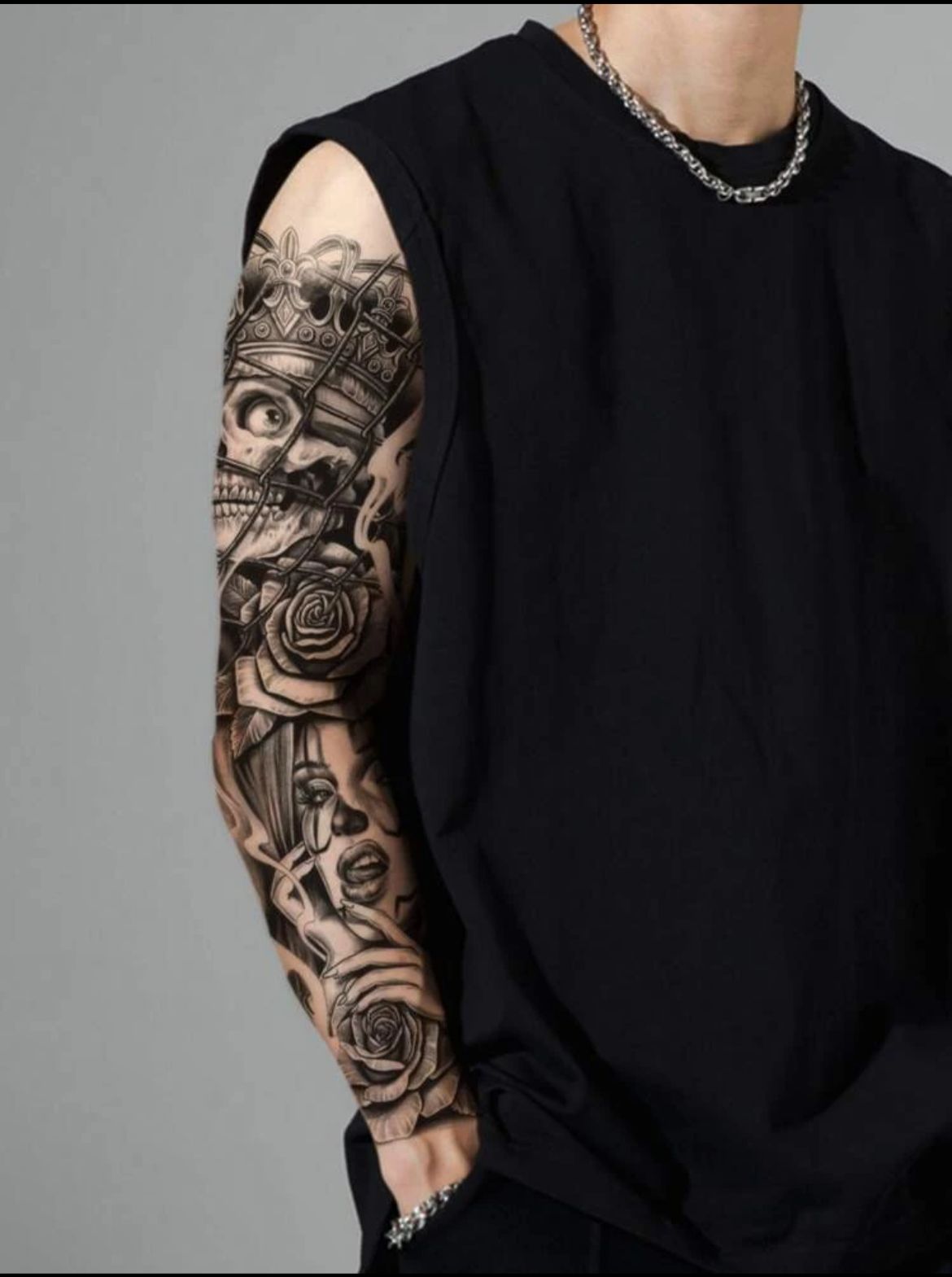 Full Arm Tattoo Sticker With Skull, Flower And Figure Pattern – Lasts For (2-5 Days)