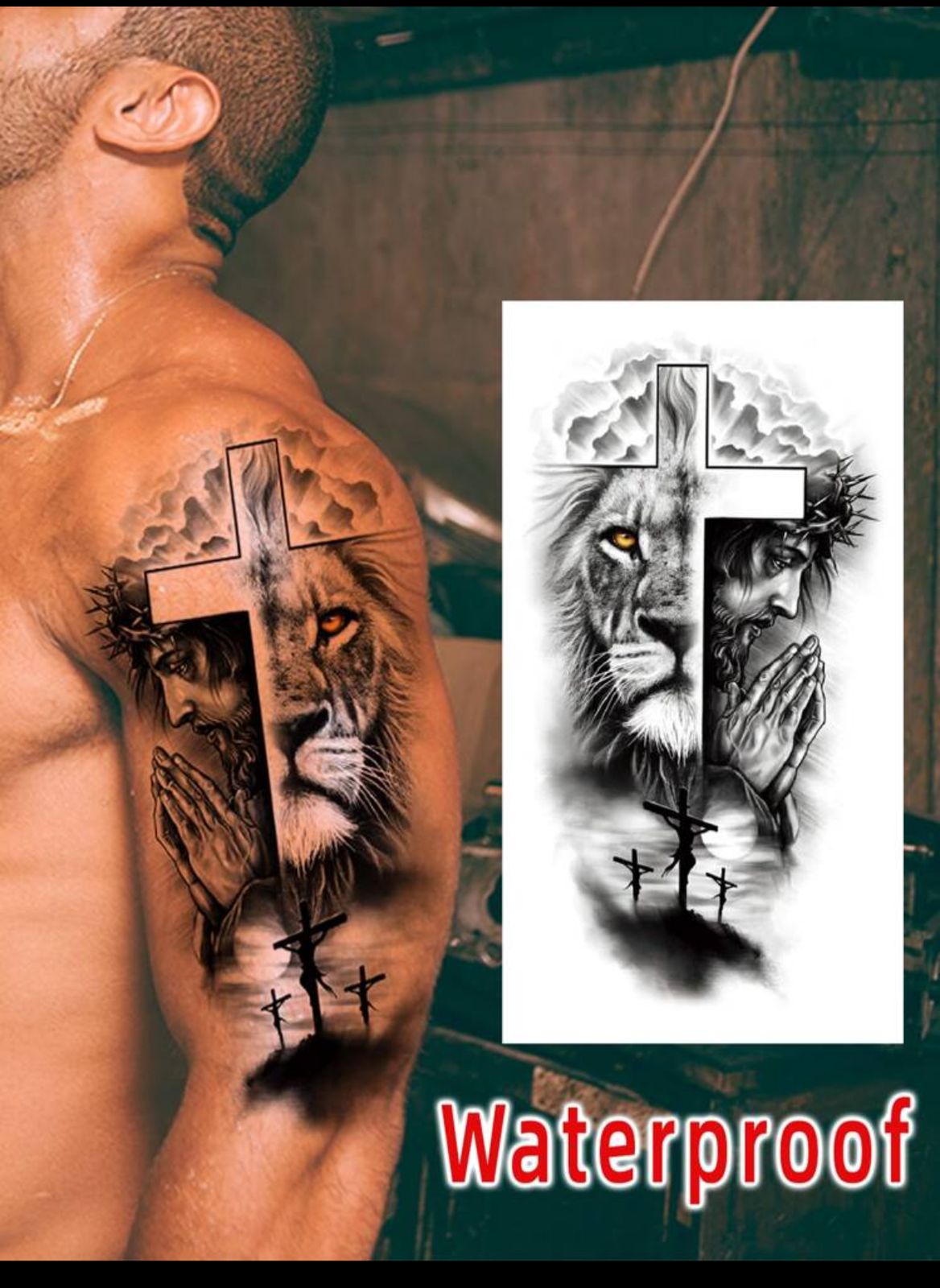 Waterproof Arm Half Sleeve Lion Temporary Tattoo Sticker For Men & Women With A Cross & Christ Jesus Tattoo Sticker Sheet.